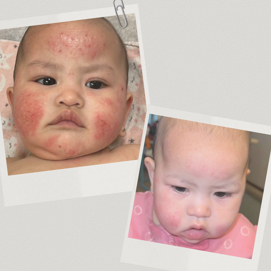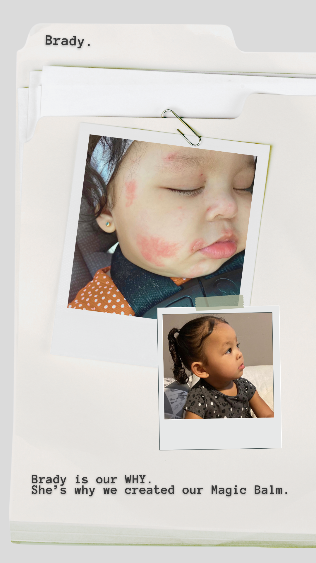 She had minor eczema on her face, that became very severe over night. My poor baby used to bleed from her cheeks because of how raw & inflamed her eczema was. It would just make me cry, I would feel so helpless! It got so bad, that after trying everything, we finally went to the doctor. They prescribed a topical steroid ointment that would make her scream from the stinging every time we applied it. I only know this, because I have eczema as well & it stung me on parts where I didn’t even have an open wound of flare up. So, I can only imagine my poor 6-month old daughters open eczema wounds.Another thing that we really hated about this ointment was that it was made with a bunch of toxics chemicals. Her eczema was on her face, she’s a baby... so obviously she would touch her mouth, put her fingers in her mouth, etc. it was nerve wracking not knowing if she’d have any reaction from ingesting those harmful chemicals. Lastly, the discoloration from using the steroid creams... it stripped her skin color off & she was left with white patches underneath the eczema. I got sick of using them, so I decided to do my own research. Finally... I started applying Castor Oil! It helped, but it wasn’t strong enough to combat everything by itself. I did more research & created a Magic Balm! I used it on Brady, within days her skin cleared up. Her skin was repaired & replenished, she loved applying it because she knew that it would easer her irritation from flare ups. Crazy... you may think a baby won’t know these things, but they catch on. Her discoloration is nonexistent & her natural skin tone is back! Her skin is glow-y! The eczema has almost completely gone away now! Aside from a small flare up after certain foods, she is back to normal. It’s crazy to think that if I never created this product, she may still be battling with this... I’m so thankful & blessed to have helped so many other families, men, women, children! Magic Balm is made with 100% natural ingredients that do no harm, but all good to our skin & bodies. I am proud of the products I create!